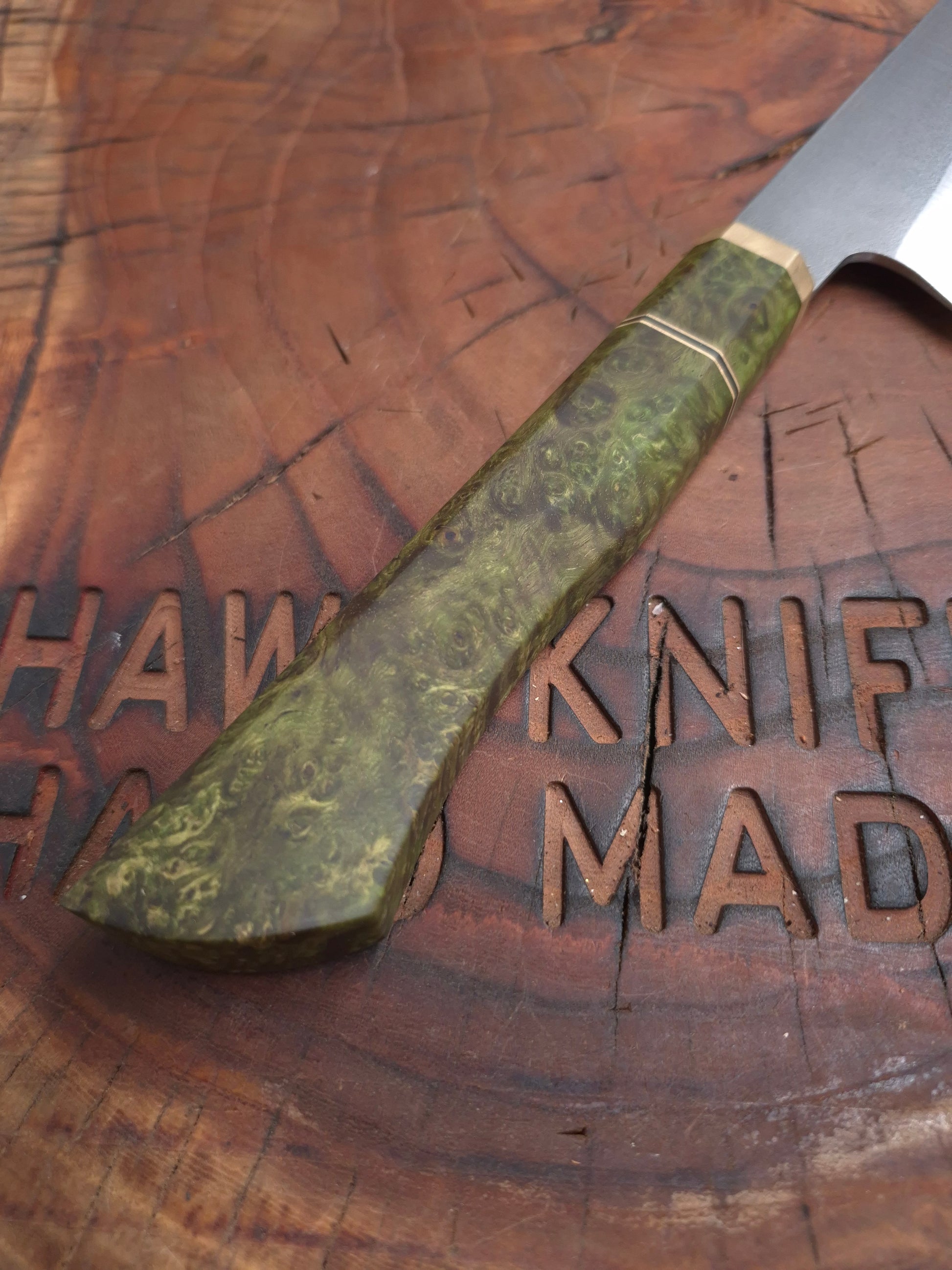 - HANDLE: HAND-FORGED BRASS BOLSTER, STABILIZED WOOD
